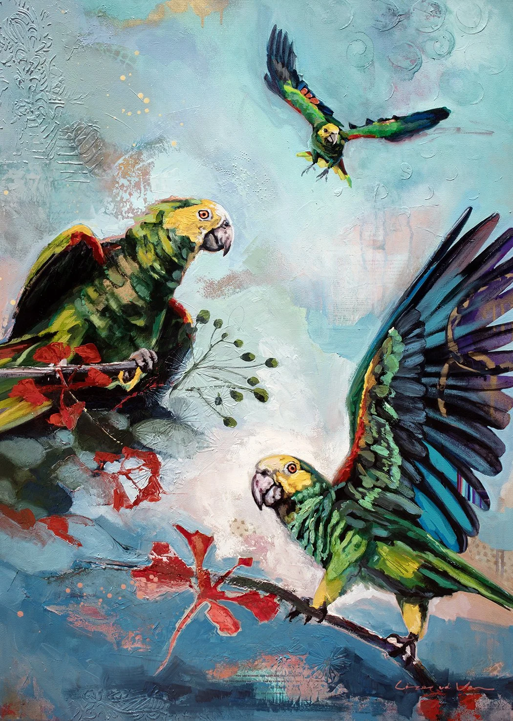 Bring the vibrant hues of the sassy Caribbean parrots into your home with this stunning artwork. The rich greens, fiery reds, and brilliant yellows of these majestic birds will captivate your senses and transform any space. A breathtaking piece that speaks to the beauty of nature.