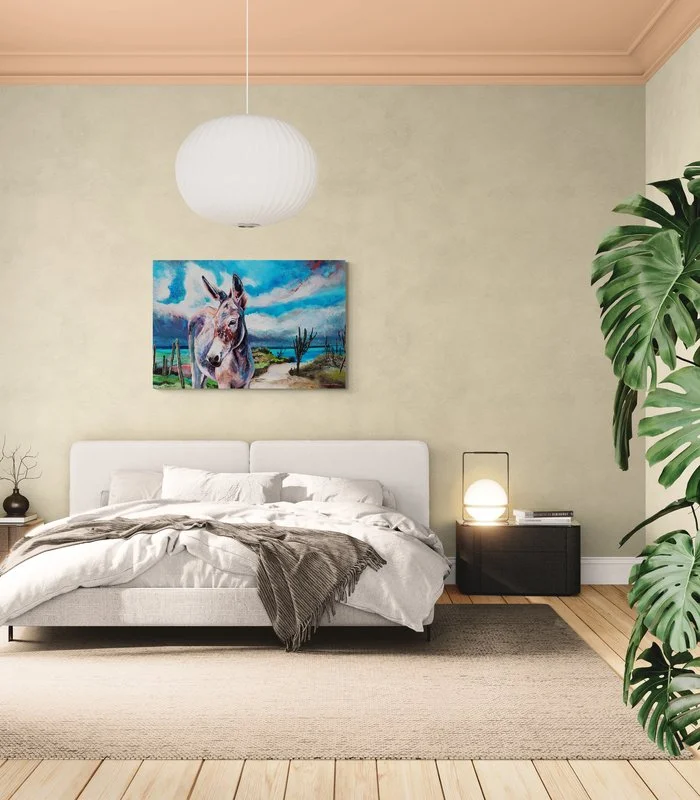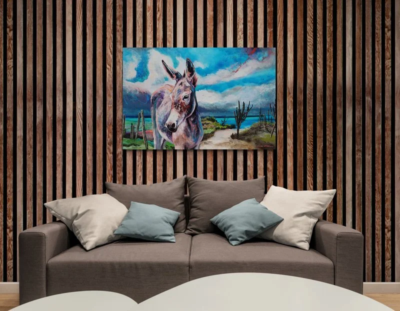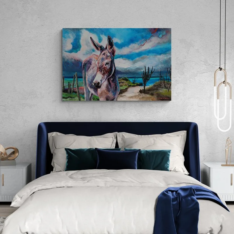 Capture the spirit of the Caribbean with this breathtaking mixed-media painting. The donkey, rendered in rich, textured hues, stands serenely before a breathtaking vista of vibrant turquoise waters, stark cacti, and a dramatic, cloud-filled sky. This piece is a testament to the artist's talent for capturing both the raw beauty and subtle nuances of nature. A perfect centerpiece for living rooms, studios, or any space that demands a touch of exotic flair and artistic energy.