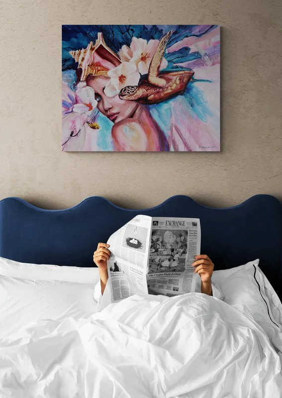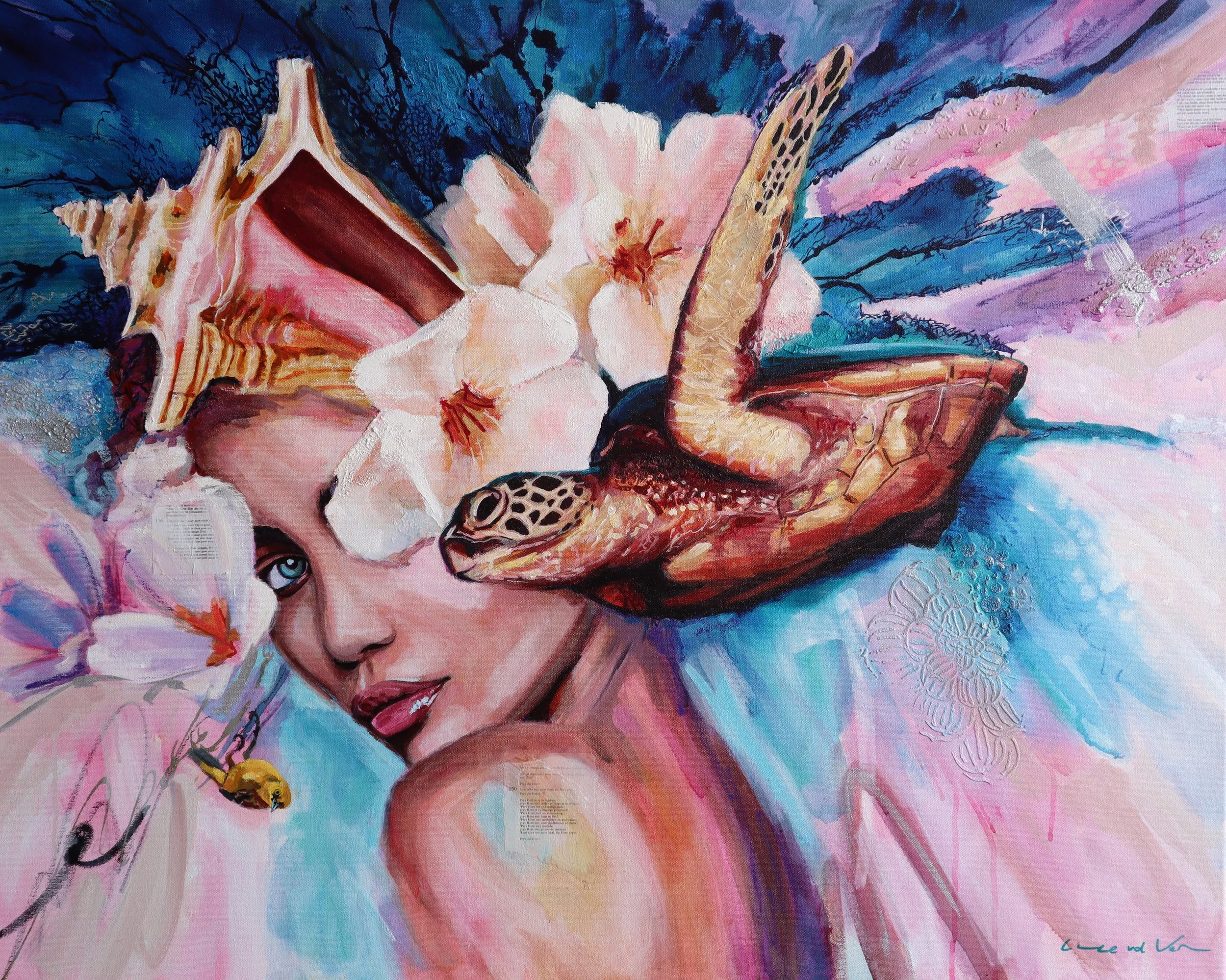 Lose yourself in the ethereal beauty of "Encircled," a dreamy portrait that celebrates the feminine spirit and its deep bond with the natural world. Soft hues of blue and pink intermingle with the strength of a sea turtle and delicate florals, creating a piece that is both powerful and exquisitely gentle. A truly unique statement for any art enthusiast.