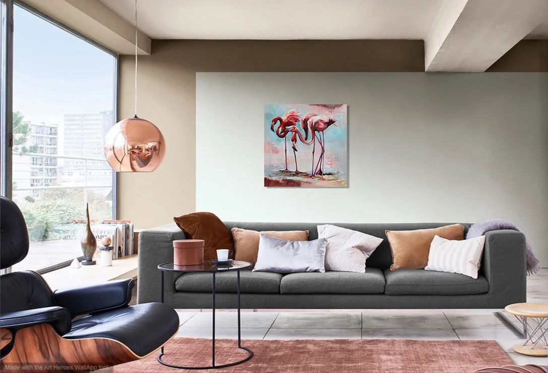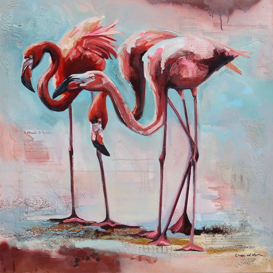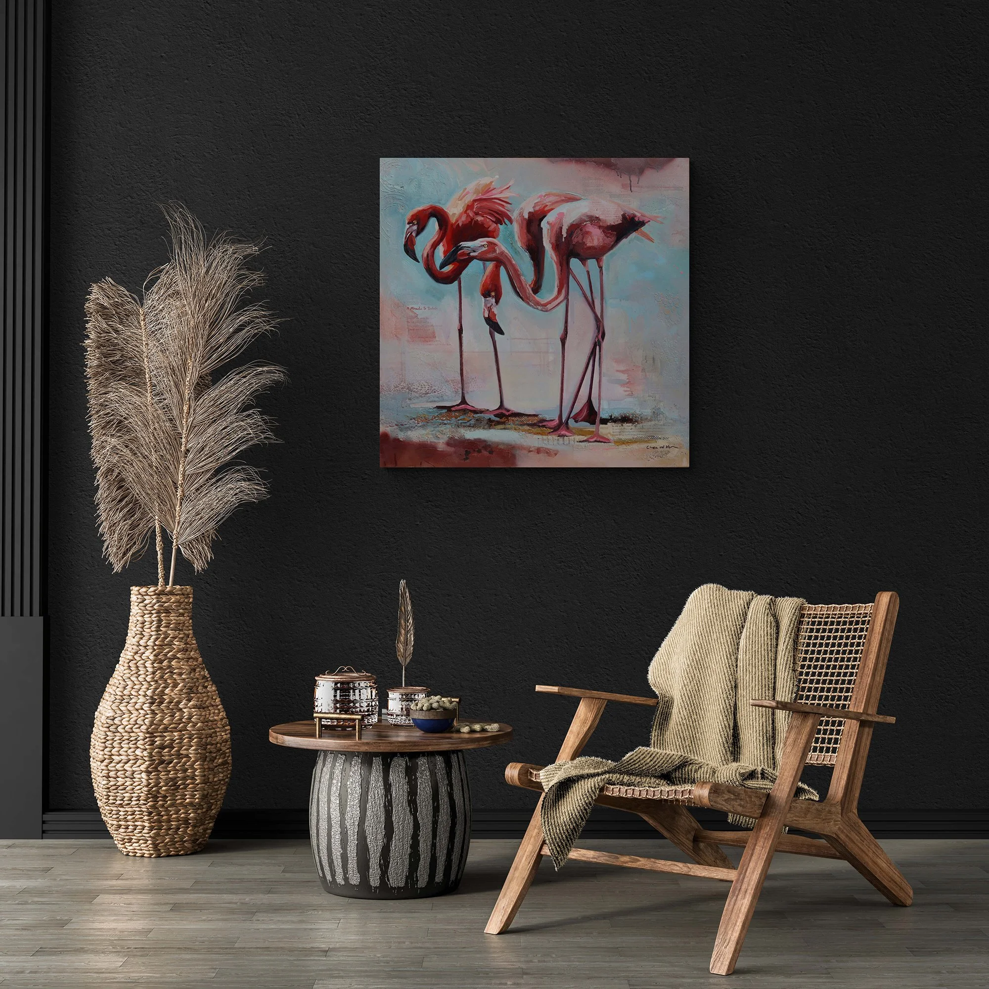 Capture the exquisite beauty of these majestic birds in this stunning mixed-media artwork. The vibrant hues and textured layers create a piece that is both captivating and sophisticated, perfect for adding a touch of tropical paradise to your home or office.