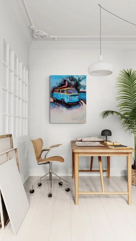 Relive the magic of summer days gone by with this captivating piece. The nostalgic charm of a vintage VW bus, brimming with surfboards and adventure, will transport you back to carefree days and unforgettable moments. A perfect conversation starter and a beautiful reminder of simpler times.