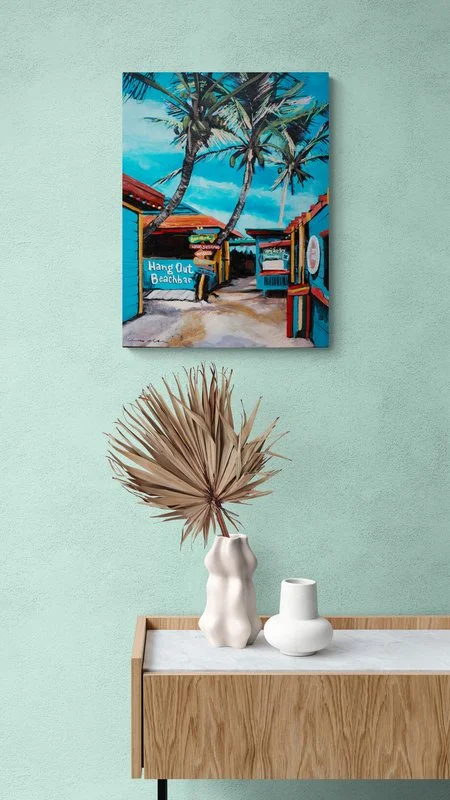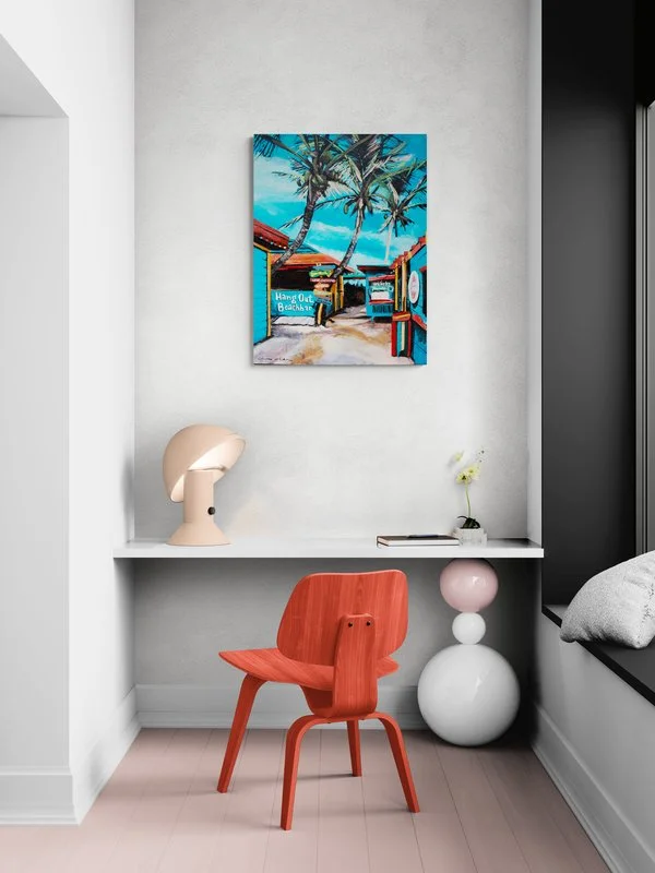 An encapsulation of a tropical getaway. Imagine yourself strolling down a sun-drenched path, the sounds of the ocean in the distance, and the promise of relaxation at the Hang Out Beachbar. This piece transports you to paradise each time you gaze upon it.