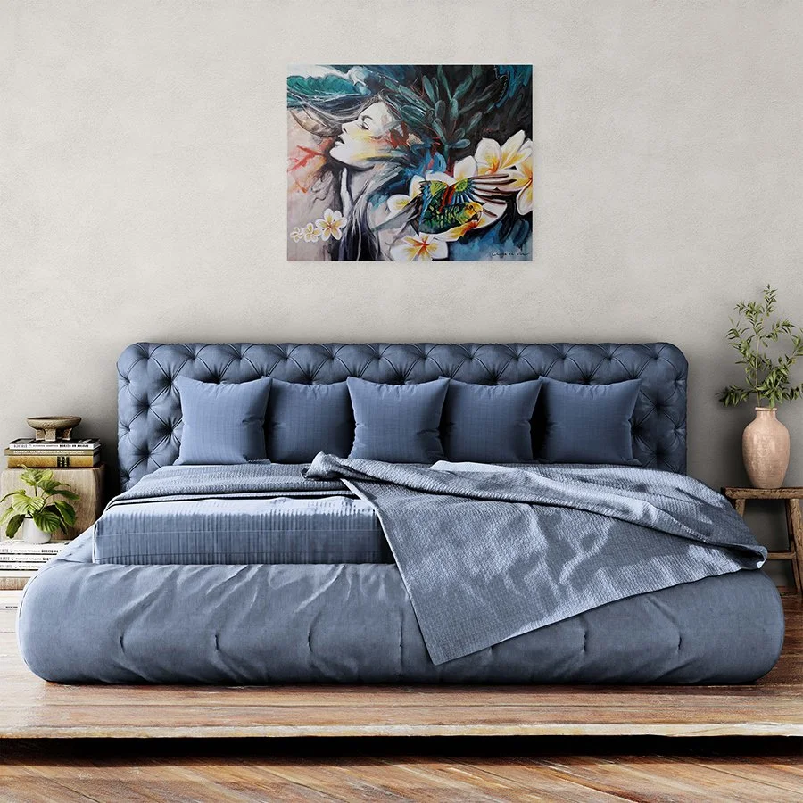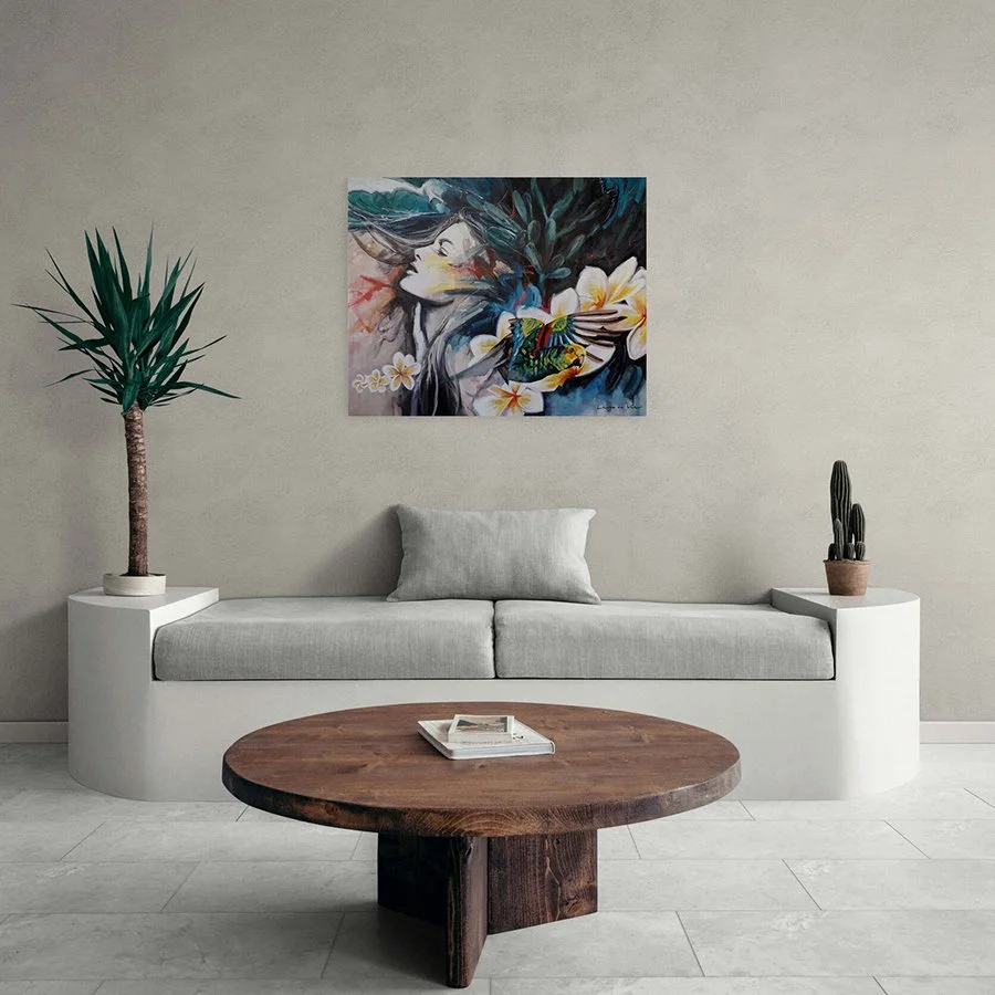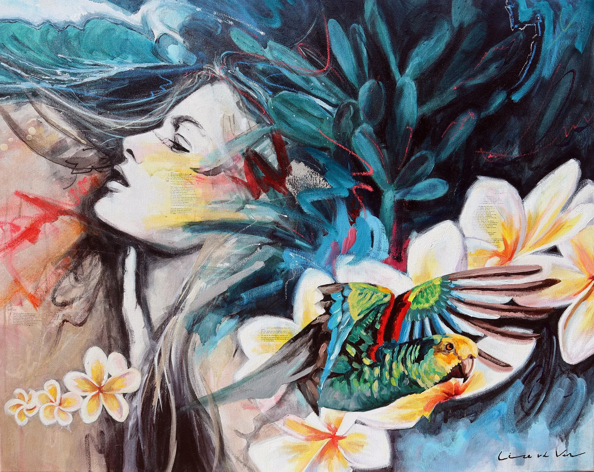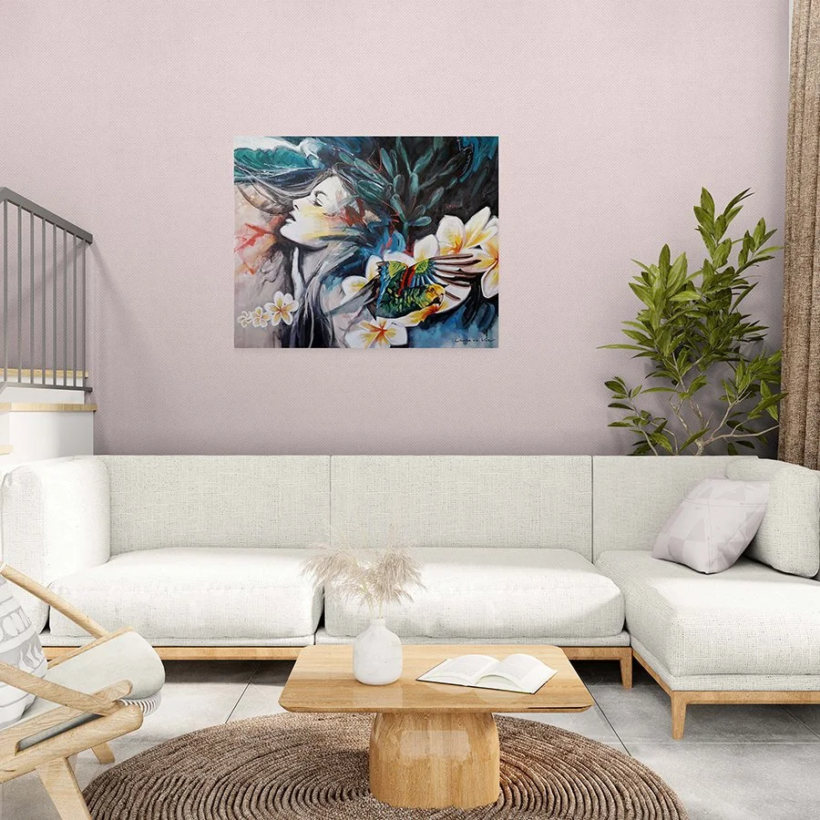 This captivating artwork evokes a powerful sense of freedom and mystery. The interplay of vibrant colors, flowing hair, and exotic birds creates a mesmerizing visual experience. Bring the enigmatic beauty of "Tropical Breeze" into your home and let its story unfold.
