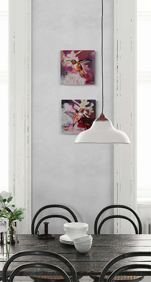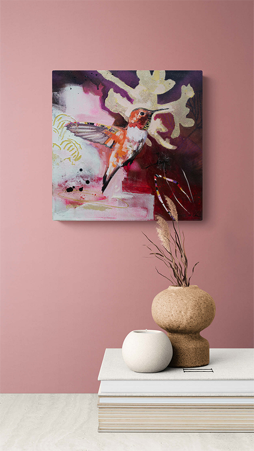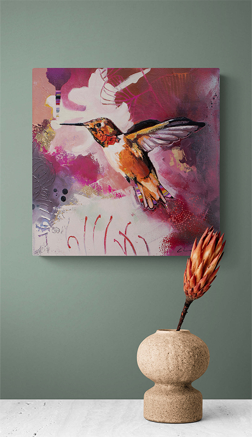 A stunning paintings capturing the beauty and energy of a hummingbird in flight. Bold colors, expressive brushstrokes, and a unique mixed-media style. Bring nature's artistry into your home.