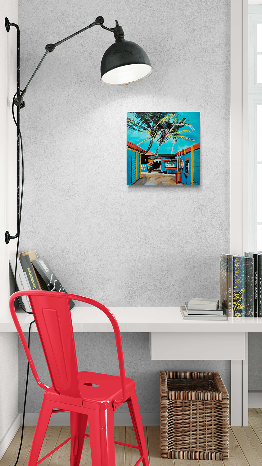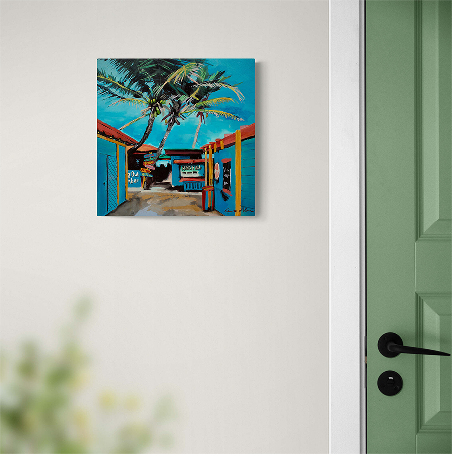 Island life captured on canvas. This evocative painting showcases the charming architecture and vibrant atmosphere of a Caribbean beach town. Filled with colorful details, from the swaying palm trees to the inviting 'Hang Out' bar, this artwork is a perfect tribute to island life, a reminder of warm breezes and sandy toes.