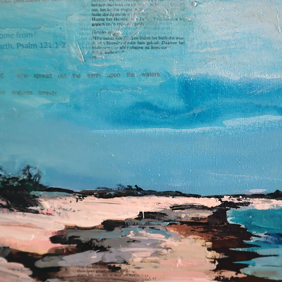 This abstract seascape evokes a sense of serenity and peace, capturing the vastness of the ocean under a bright sky. The piece suggests a feeling of freedom and escape, inviting the viewer to contemplate the beauty of nature.