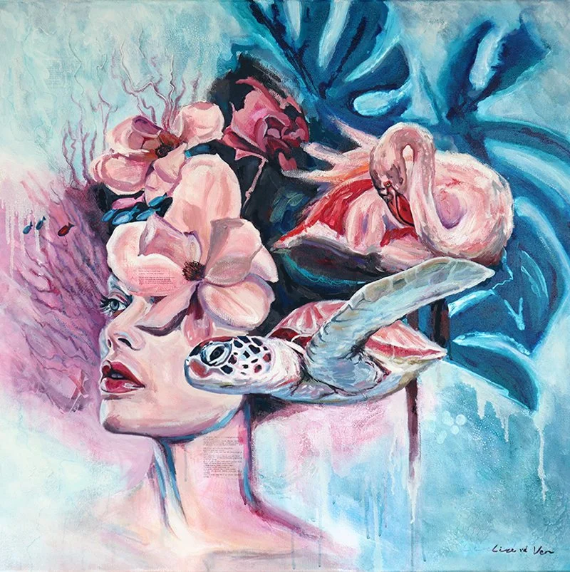 Explore the layers of meaning in this captivating painting. A woman's face, adorned with exotic blooms and marine creatures, hints at a deeper connection between nature and the human spirit. What secrets does it hold?