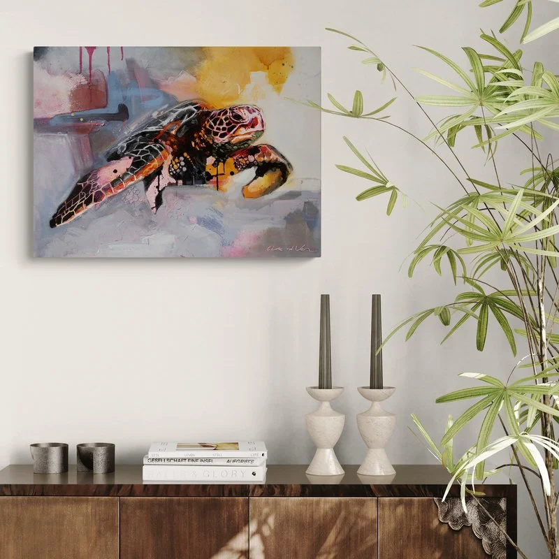 Experience the unique fusion of abstract expressionism and realistic detail in this captivating artwork. The artist's masterful use of color, texture, and bold strokes brings the sea turtle to life with raw energy and emotive power. A stunning statement piece for discerning collectors.