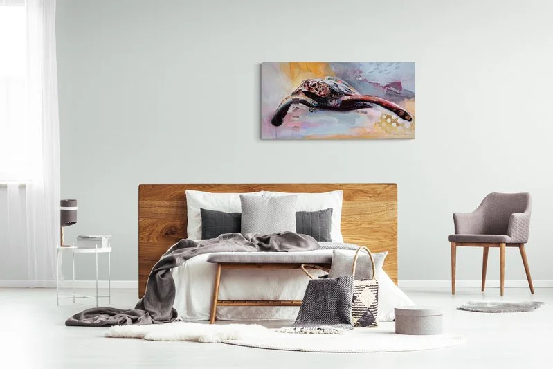 Bold colors, rich textures, and abstract elements intertwine to create a unique and unforgettable portrayal of a sea turtle. A breathtaking example of contemporary art that fuses realism with artistic freedom.