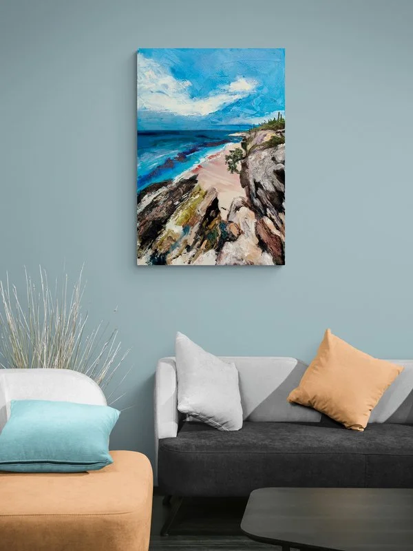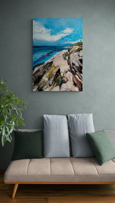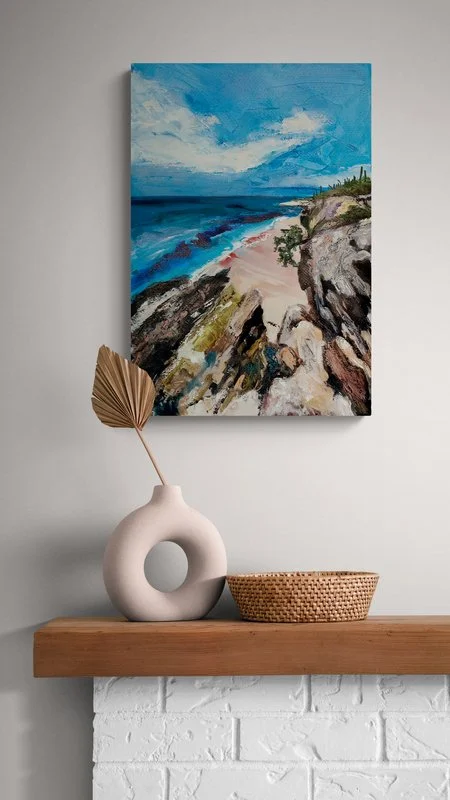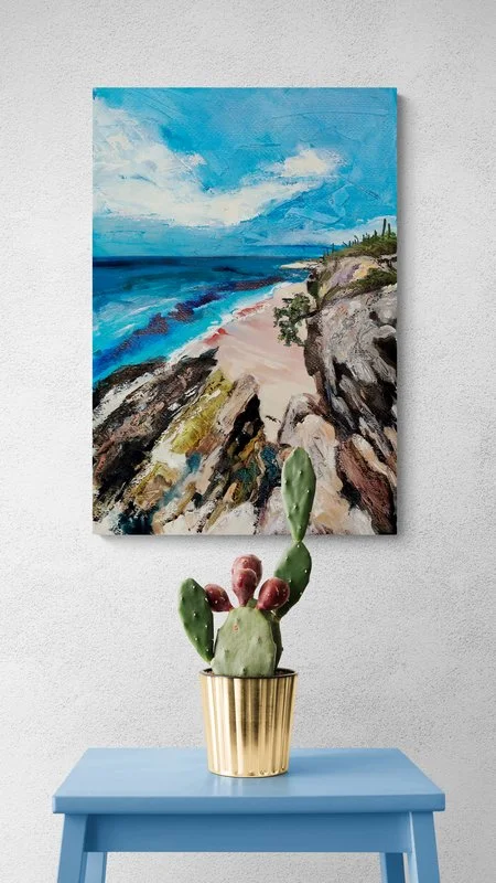 Transport yourself to the captivating shores of the Caribbean with "COLORS OF BONAIRE," a vibrant and textured landscape. This stunning artwork captures a dramatic coastal vista, where rugged cliffs meet a pristine beach and the mesmerizing turquoise waters of the sea. Above, a dynamic sky of brilliant blues and white clouds completes the breathtaking scene. Lize's signature expressive brushwork and rich impasto textures bring the island's unique beauty to life, from the earthy tones of the rocks to the subtle pinks of the sand and the intense blues of the ocean. "COLORS OF BONAIRE" is an immersive piece that evokes the warmth, tranquility, and untamed charm of a tropical paradise, perfect for bringing a piece of island serenity into your home.