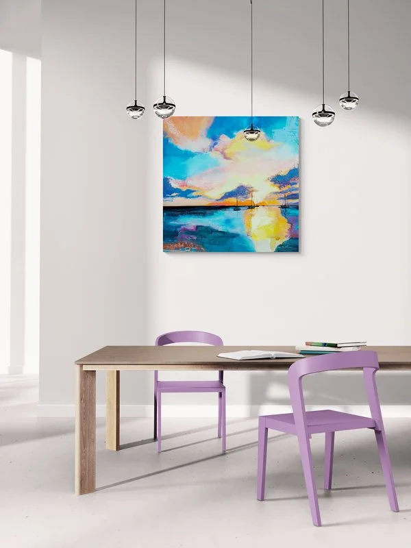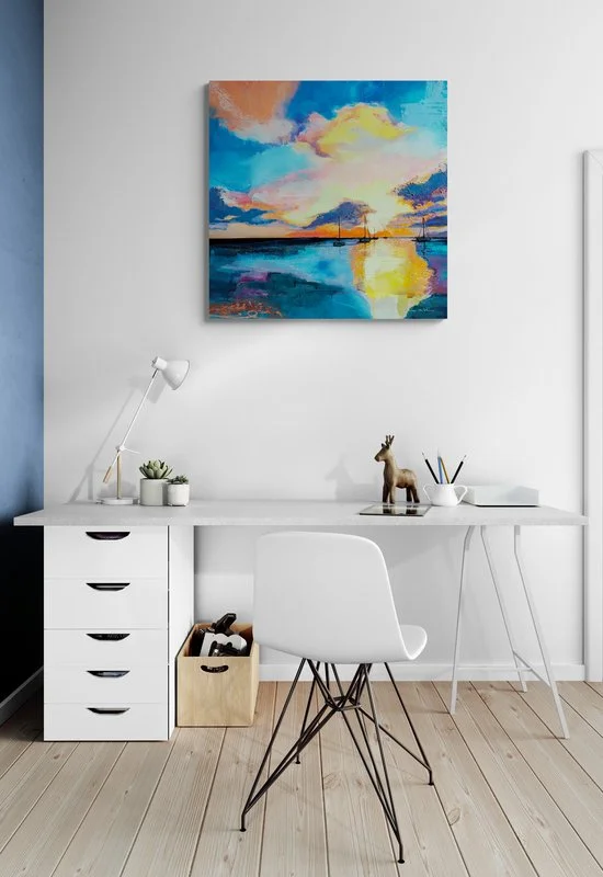 This vibrant artwork captures the dramatic spectacle of a sunset over tranquil waters, with a sky ablaze in a symphony of warm oranges, soft pinks, and brilliant yellows, contrasted by deep, textured blues. Silhouettes of sailboats dot the horizon, inviting contemplation and a sense of peaceful adventure. Lize's signature expressive brushwork and rich impasto textures create a dynamic scene where light dances on the water, making this a truly luminous and inspiring piece for any space.